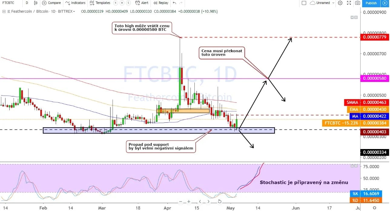 Feathercoin (FTC) konečně dorazil k supportu v úrovni 0.00000334 BTC. Zatím bych byl, díky právě končícímu týdnu, opatrný na předčasné soudy. Ale pokud zítra weekly zavře okolo svého open, tak můžeme příští týden očekávat pravděpodobně pohyb UP. Původní korekce se nám trochu protáhla, nicméně trh právě otestoval své současné dno.