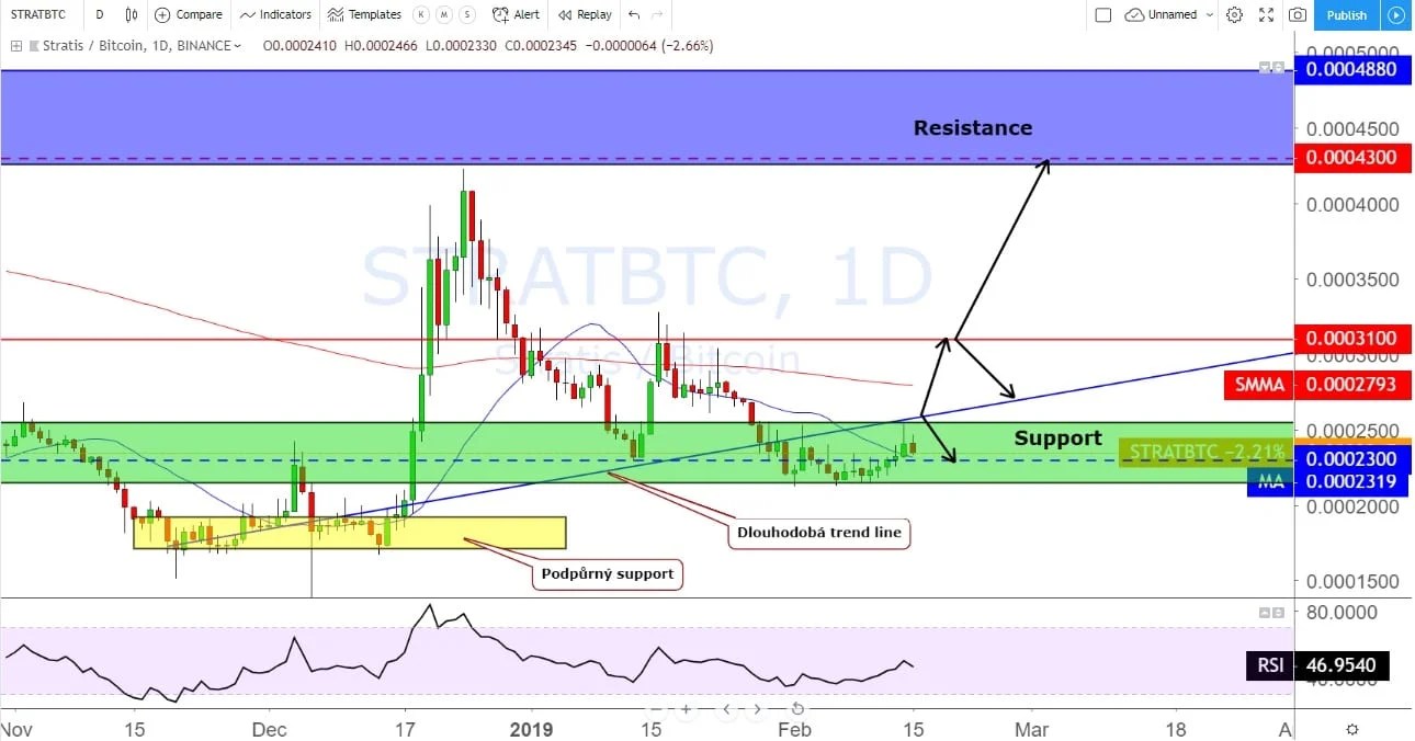Podporu býků získá cena až po návratu nad trend line. Za současné situace by to bylo někde okolo ceny 0.0002600 BTC, a čím déle bude návrat trvat, tím se také bude úroveň posouvat výše. Z dlouhodobého pohledu má STRAT potenciál dosáhnout hodnoty 0.0004300 – 0.0004400 BTC. Ale jak jsem již napsal, cena se musí dostat přes dlouhodobou trend line a následně musí překonat klíčovou úroveň 0.0003100 BTC.