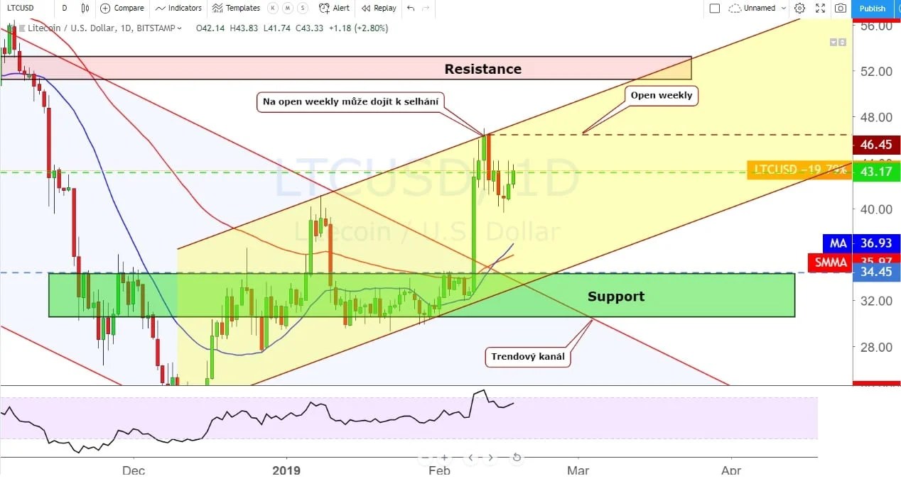 Zatím můžeme považovat cenu 39,60 $ za swingové low daily timeframu. Z pohledu weekly potřebujeme, aby si Litecoin udržel úroveň okolo 43-44 $. Poté by mohl přijít pohyb k 50 $, ale tím to nekončí!