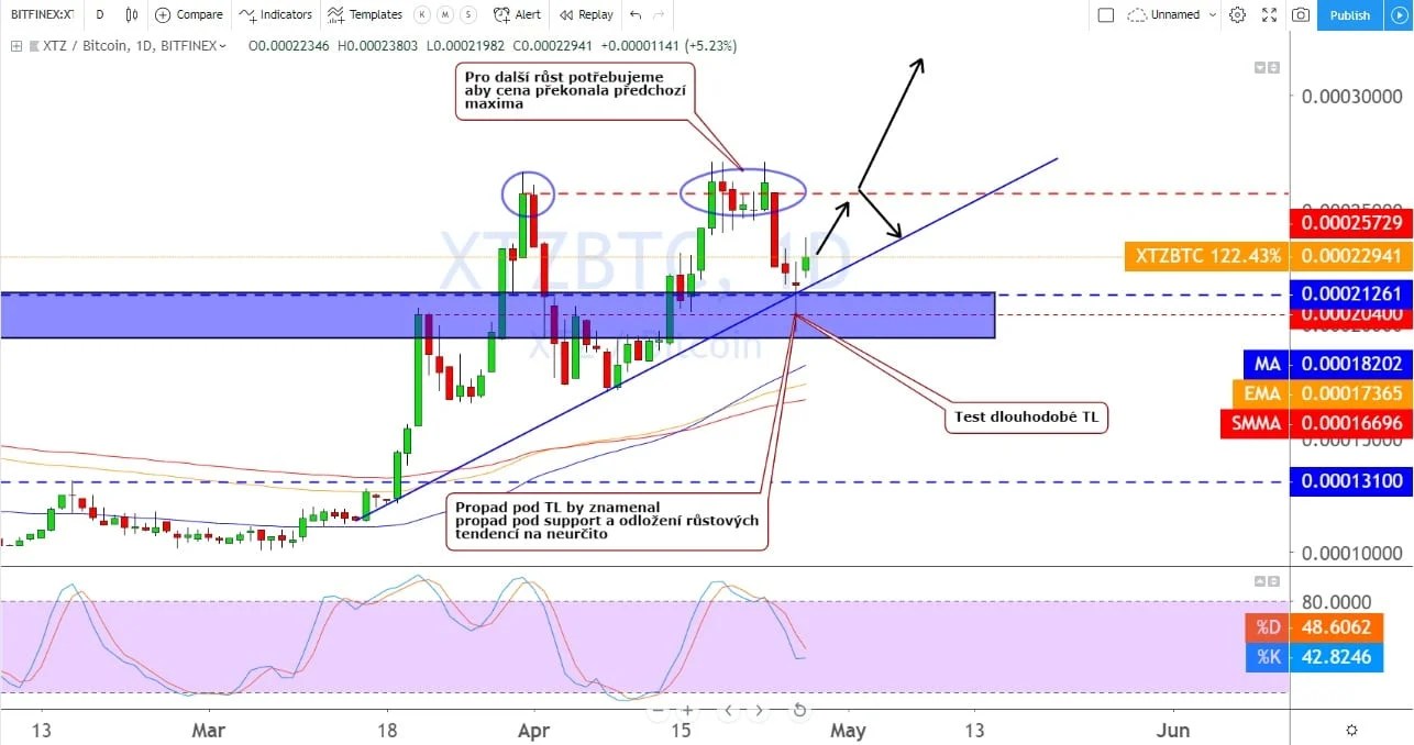 To samozřejmě zatím nikdo neví, ale překonání úrovně 0.00025729 BTC může podpořit další růst. Propad pod support by samozřejmě znamenal na nějakou dobu odložení slibovaného růstu, na který investoři čekají. Zatím vše naznačuje tomu, že se cena udrží nad supportem a později prorazí úroveň rezistence. Pokles pod support je v tuto chvíli méně pravděpodobný, i když stále hrozí, že se cena Bitcoinu zřítí do korekce. To by mohlo oslabit celý market včetně TEZOS. K otestování úrovně supportu a dlouhodobé trend-line ještě pravděpodobně několikrát dojde.