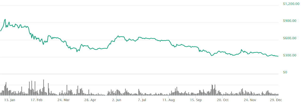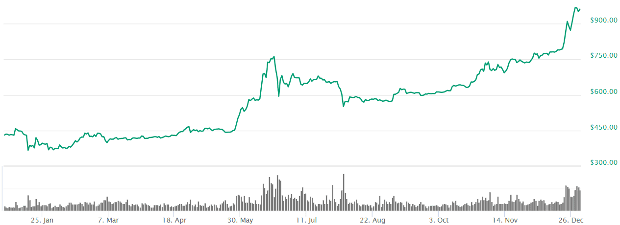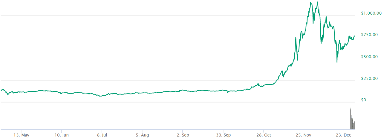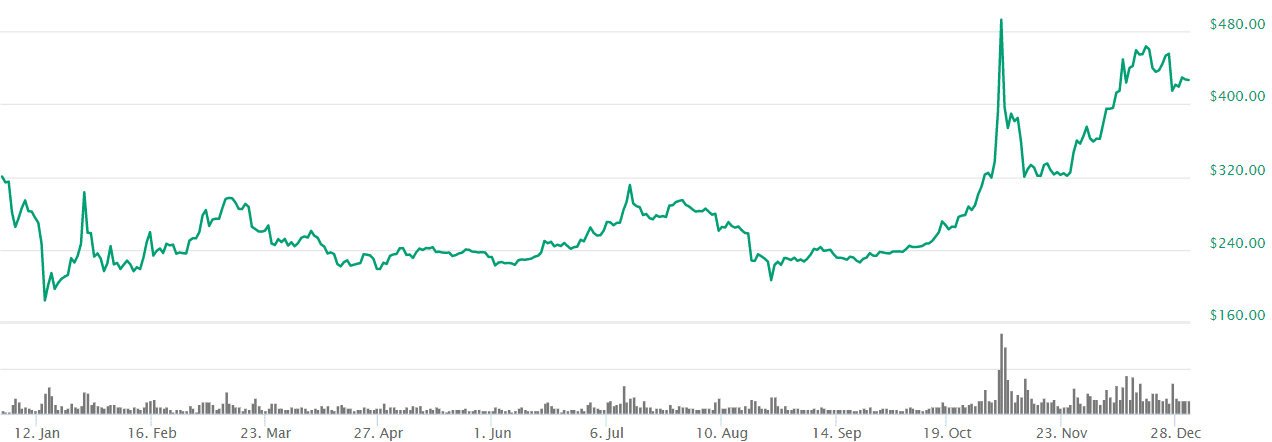 Všimnite si hlavne vysoké volume na konci roka a výrazné pohyby v oboch smeroch.