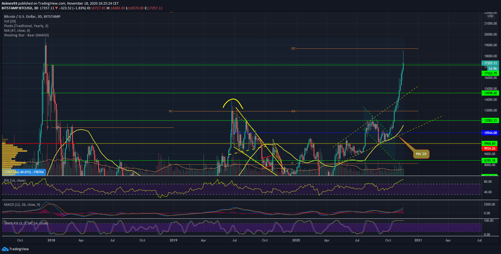 Nicméně kurz překonal další rezistenci na 17 000 USD, čímž všem shortařům dal trh tvrdou ránu. Vzhledem k tomu, jak se trh chová, jsem dospěl k závěru, že v současnosti má Bitcoin zcela pod kontrolou inteligentní entita. Pravděpodobně skupina institucí, která má jakousi strategii, které se drží.