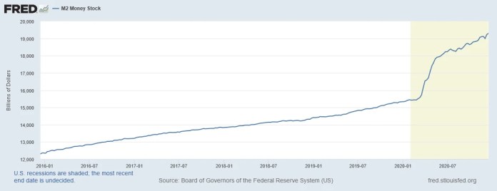 Možná někteří z vás zaregistrovali, že agregát peněžní zásoby M2 neustále stoupá, i když rozvaha Fedu je už půl roku relativně stabilní. To, že peněžní zásoba neustále roste, je nyní hlavně dáno fiskální politikou vlády Spojených států, která si nebere servítky a „tlačí“ též do ekonomiky hromadu likvidity přes nejrůznější dostupné nástroje. V každém případě byla peněžní zásoba za cca deset let navýšena o neuvěřitelných 100 %.
