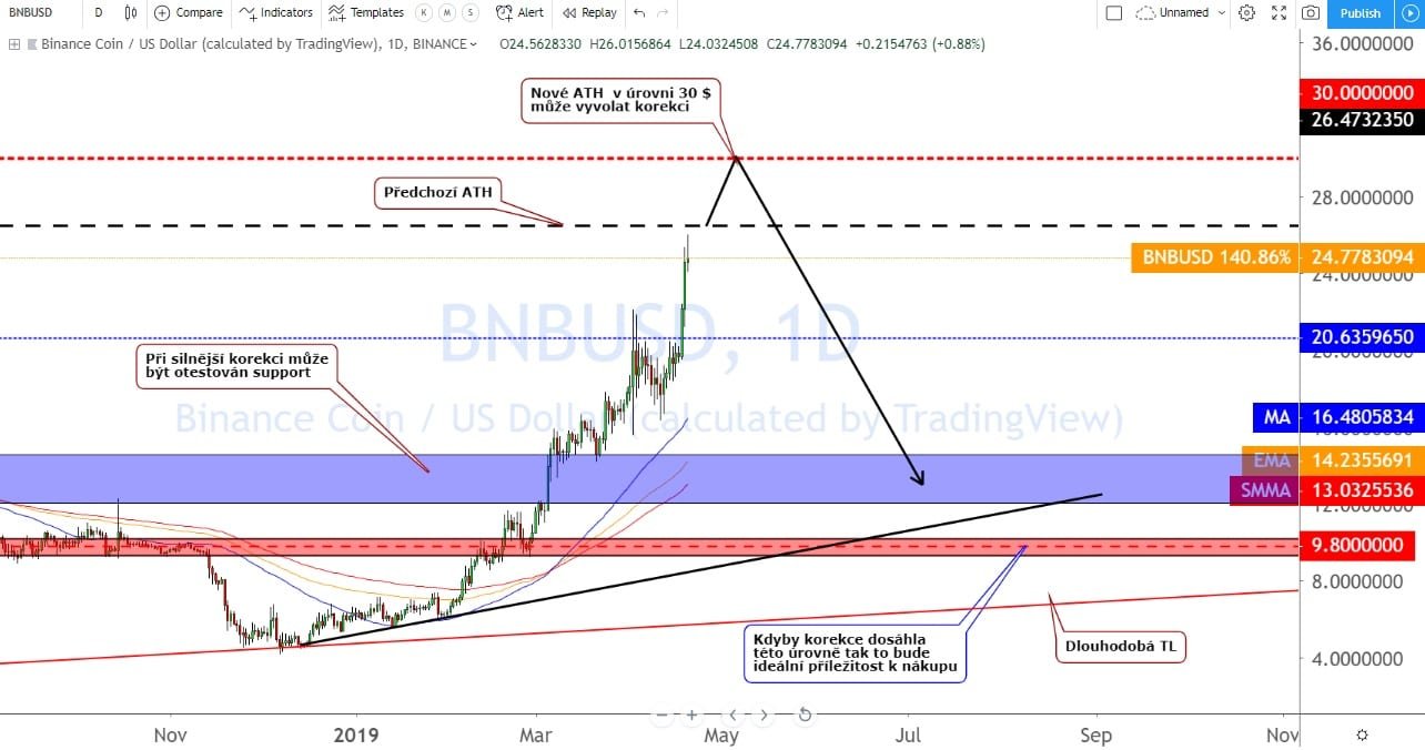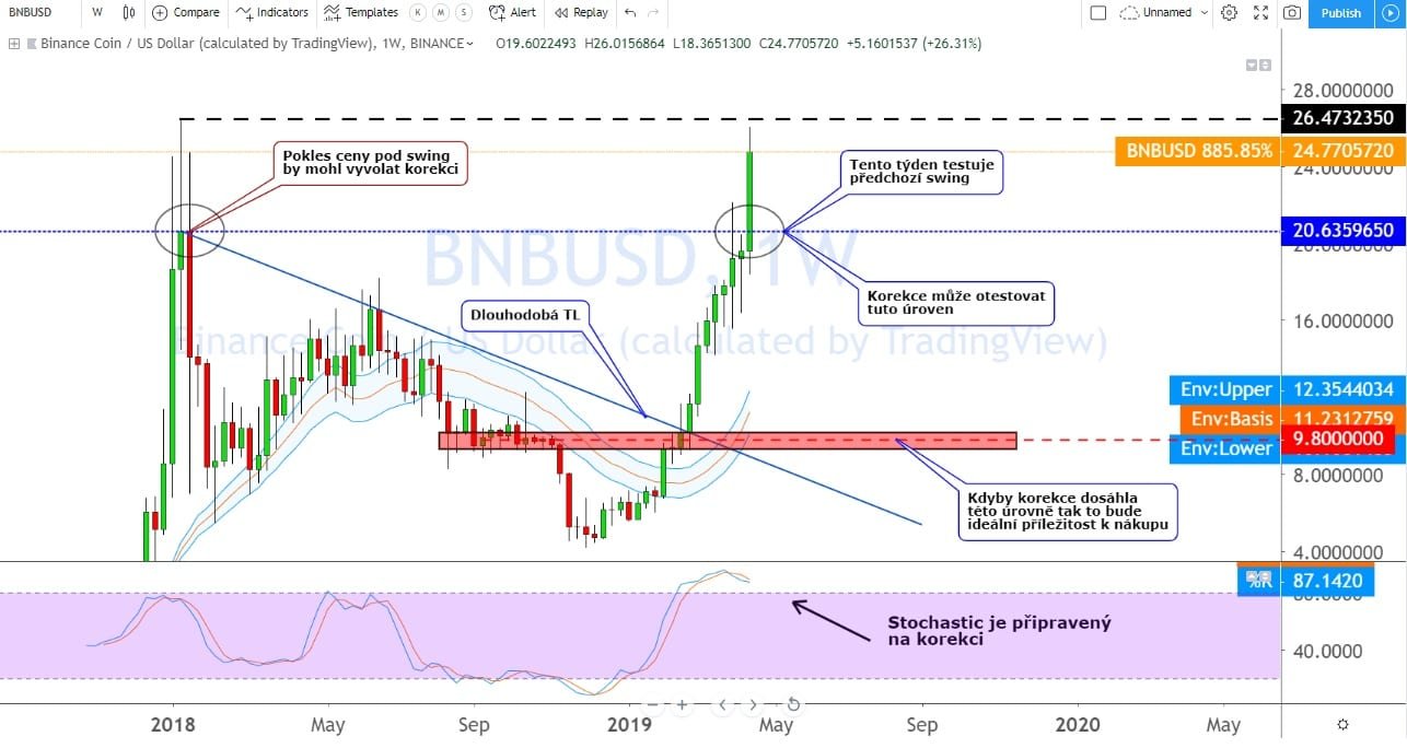 Mě osobně bude zajímat až korekce BNB. Je jedno, kdy k tomu dojde. Je to sice dobrý a promyšlený projekt, ale je na maximech. Teprve korekce nám může ukázat v jaké kondici je BNB. Cena už asi korekčně nespadne k 10-12 $, ale může otestovat úroveň 20 $. A to se může stát již příští týden, právě díky překonanému ATH. Ovšem domnívám se, že ještě otestujeme úroven 30 $ a pak by mohla přijít korekce