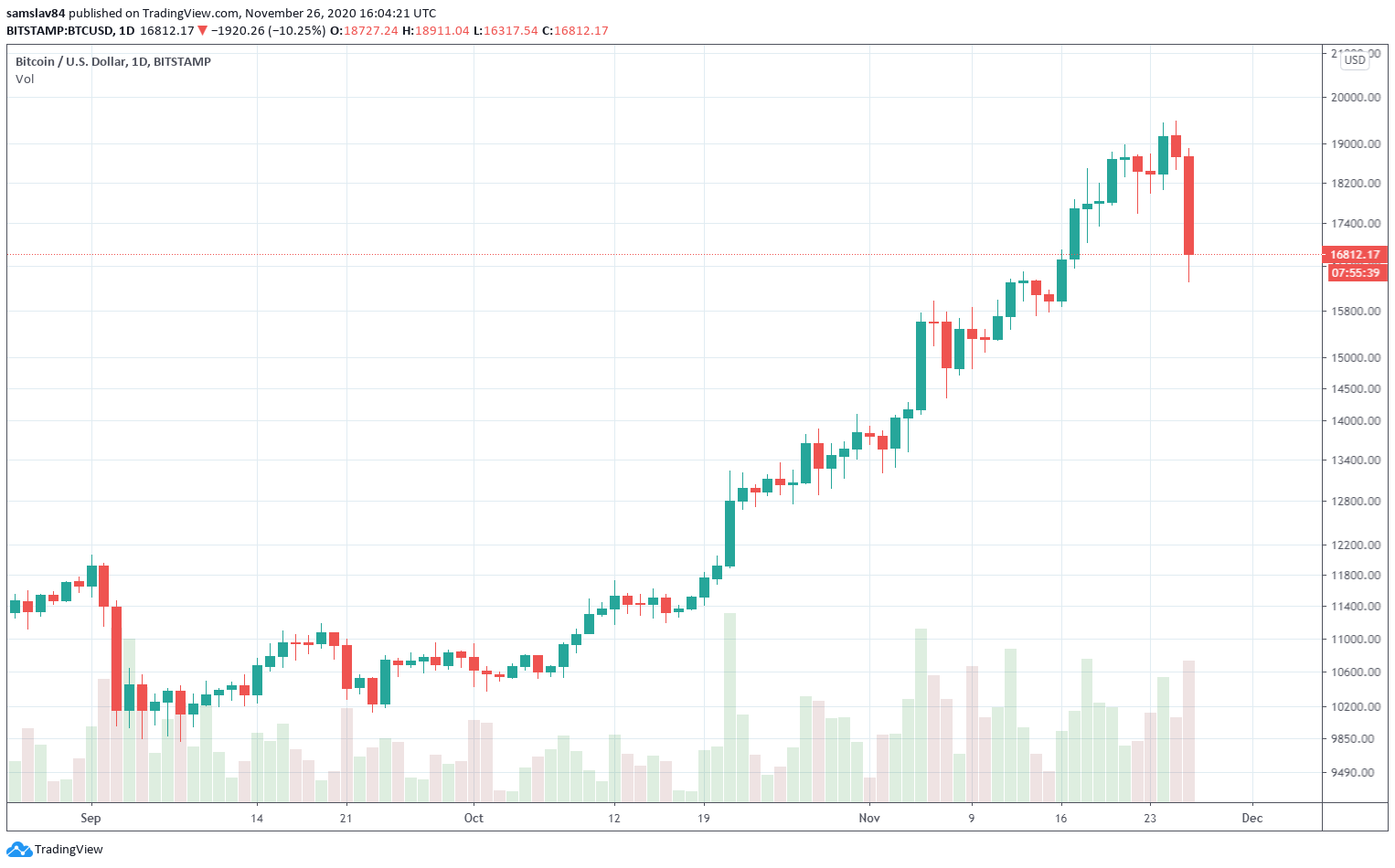 Podobně to vypadalo i na dalších platformách s BTC deriváty. Tyto likvidace svým objemem připomínají velký propad z března, kdy Bitcoin klesl až na 3700 $. Fakt, že dnes propad skončil na 16 320 $, jasně ukazuje, že zájem o Bitcoin je podstatně větší a bullish sentiment se na trhu drží i navzdory dnešní korekci.