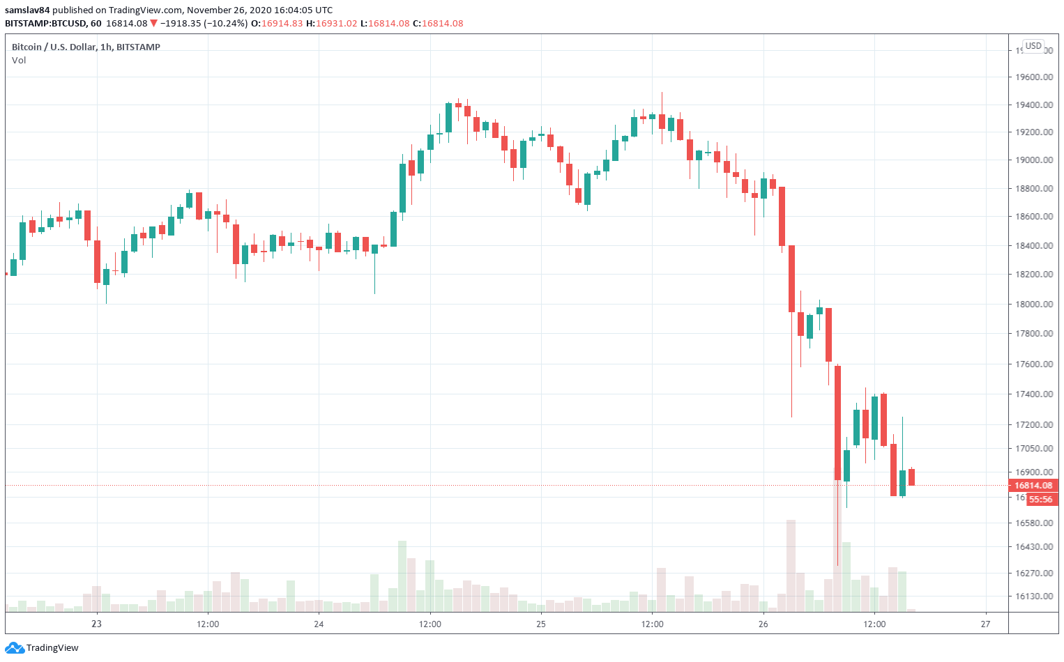 Bitcoin dnes krátce před obědem klesl na své 10denní minimum. Obrovské množství likvidací na trzích s deriváty jeho cenu srazilo až na 16 320 $. Ještě včera se přitom obchodoval na tříletém maximu 19 490 $. Cena největší kryptoměny tak v průběhu 24 hodin klesla o 16%, i když v době psaní tohoto článku Bitcoin konsoliduje nad hladinou 17 000 $. Ceny bereme z burzy Bitstamp.